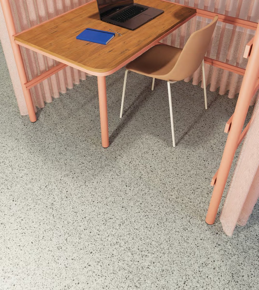 Warstwa użytkowa 0,55 mm to solidny parametr zapewniający długotrwałą odporność na ścieranie. Klasa użytkowa 33/42 potwierdza przeznaczenie zarówno dla intensywnego ruchu komercyjnego (33 – przestrzenie publiczne o dużym natężeniu), jak i lekkich zastosowań przemysłowych (42). W praktyce Terrazzo wytrzyma dekady eksploatacji w ruchliwym hotelu, restauracji, butiku, biurze czy mieszkaniu bez utraty estetyki.