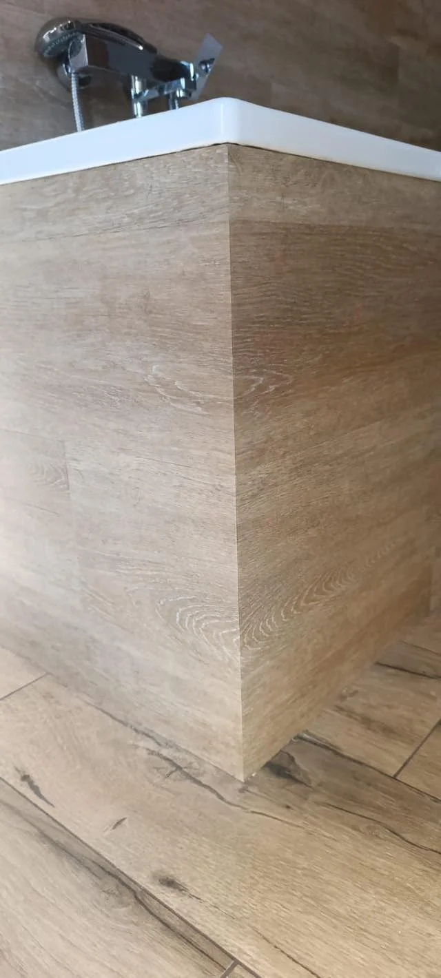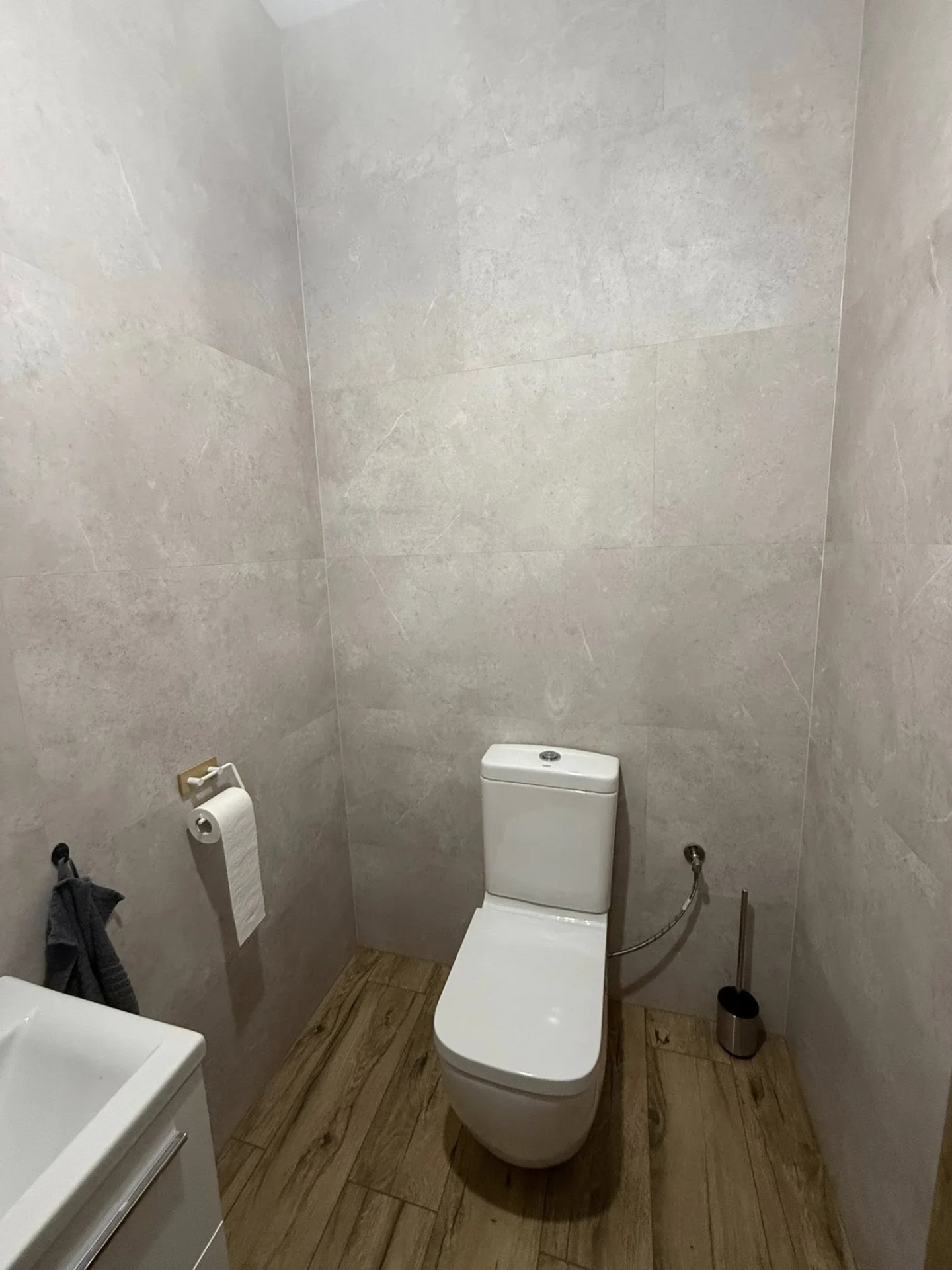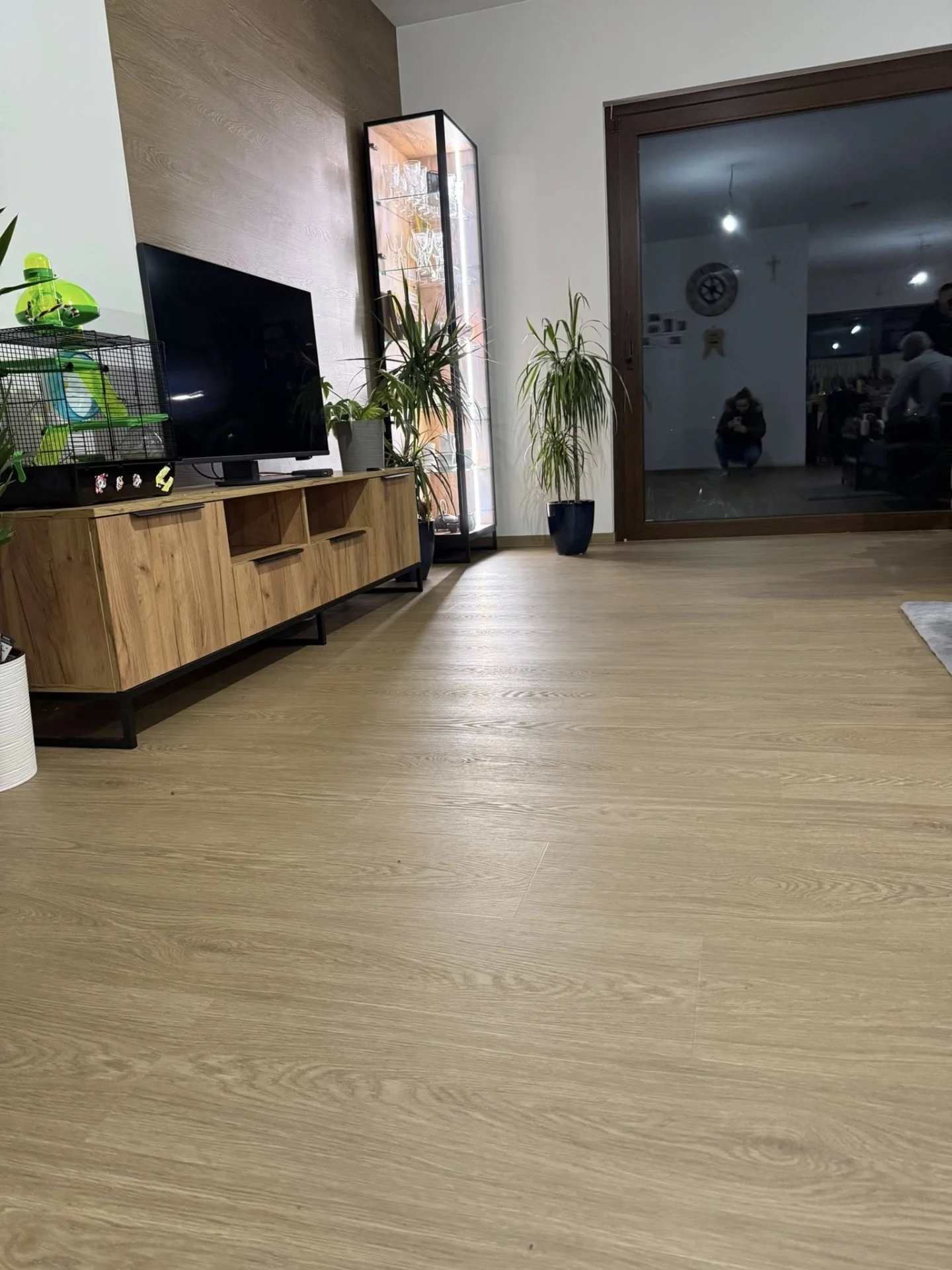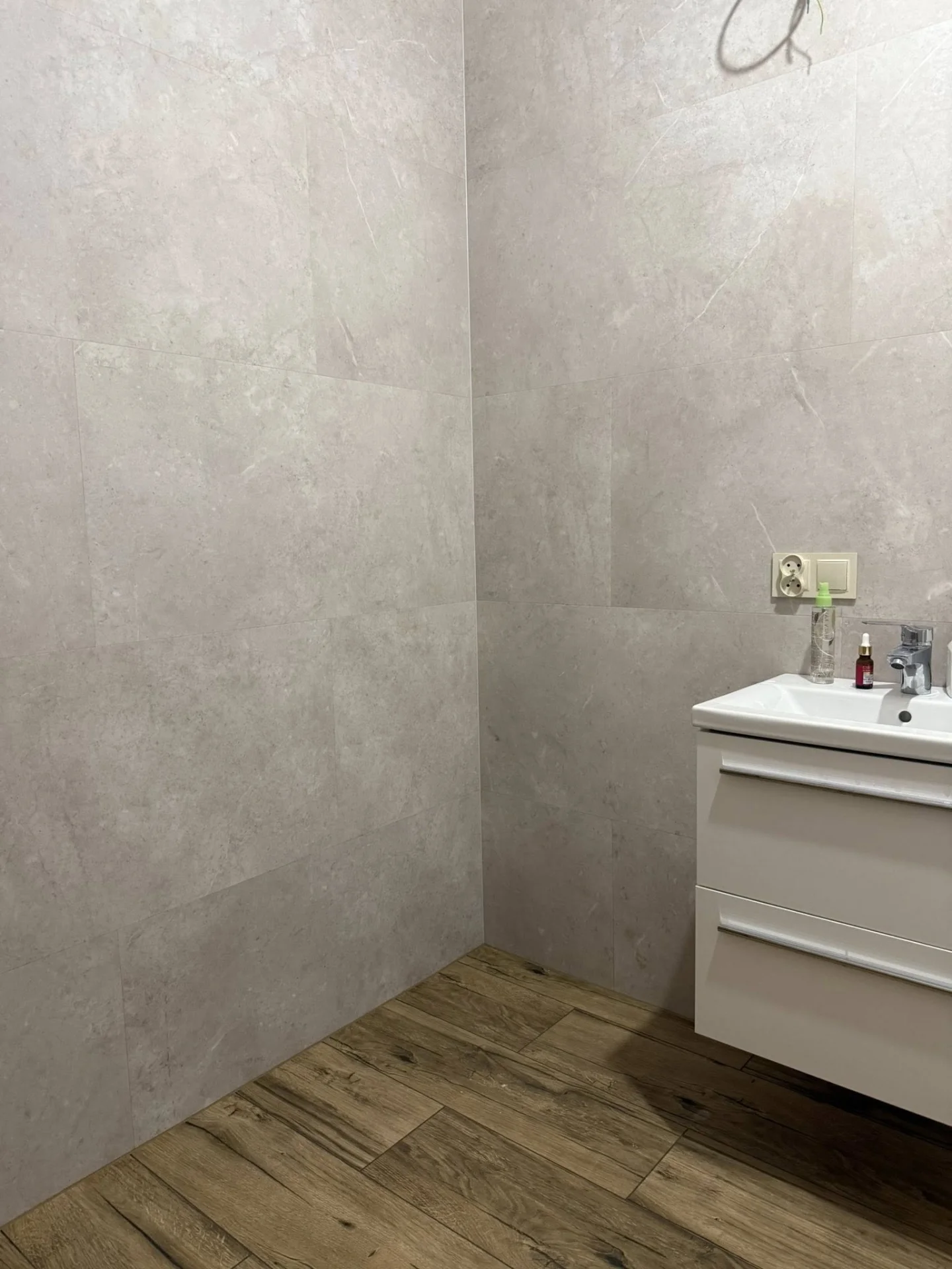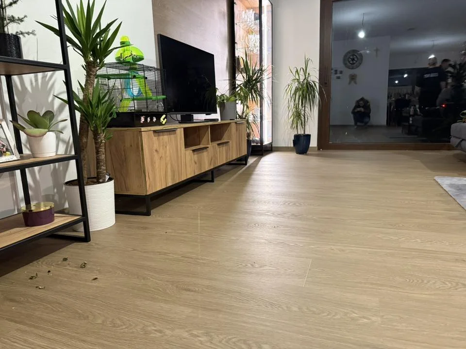 Tym razem nasze prace poszły o krok dalej – panele trafiły nie tylko na podłogi, ale również na ściany w łazienkach, kuchni i salonie. To rozwiązanie pozwoliło stworzyć spójną, nowoczesną aranżację wnętrza, która zachwyca estetyką i funkcjonalnością.