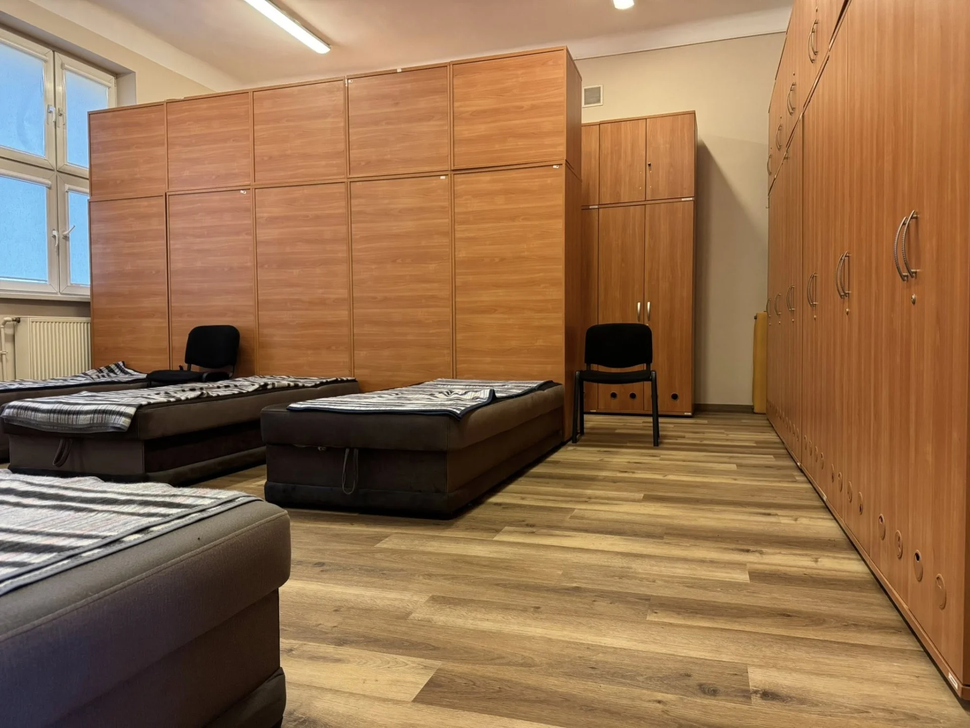 Wybrany dekor drewna wprowadził do wnętrz ciepły, domowy klimat, który idealnie komponuje się z funkcją pomieszczeń. Przestrzenie wypoczynkowe zyskały przytulny charakter, sprzyjający regeneracji sił między wymagającymi akcjami ratunkowymi. Eleganckie wykończenie biur zarządu podkreśla profesjonalny charakter obiektu.