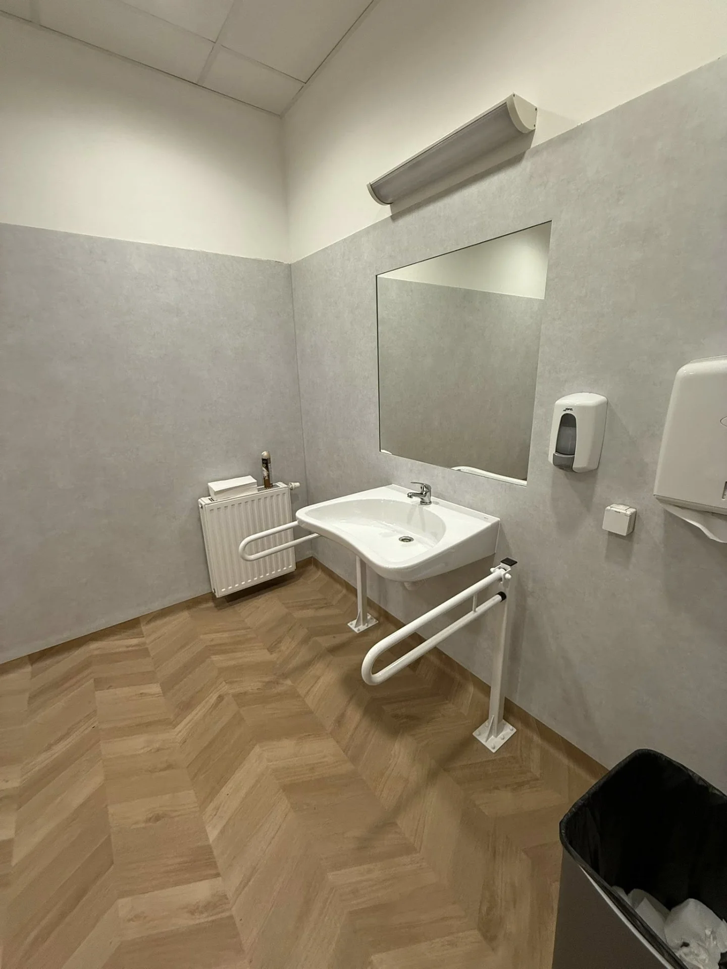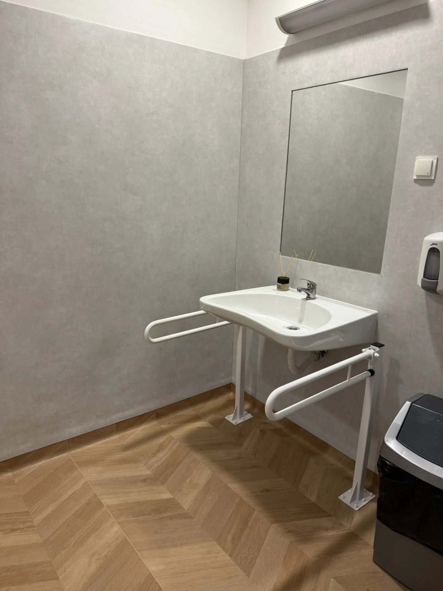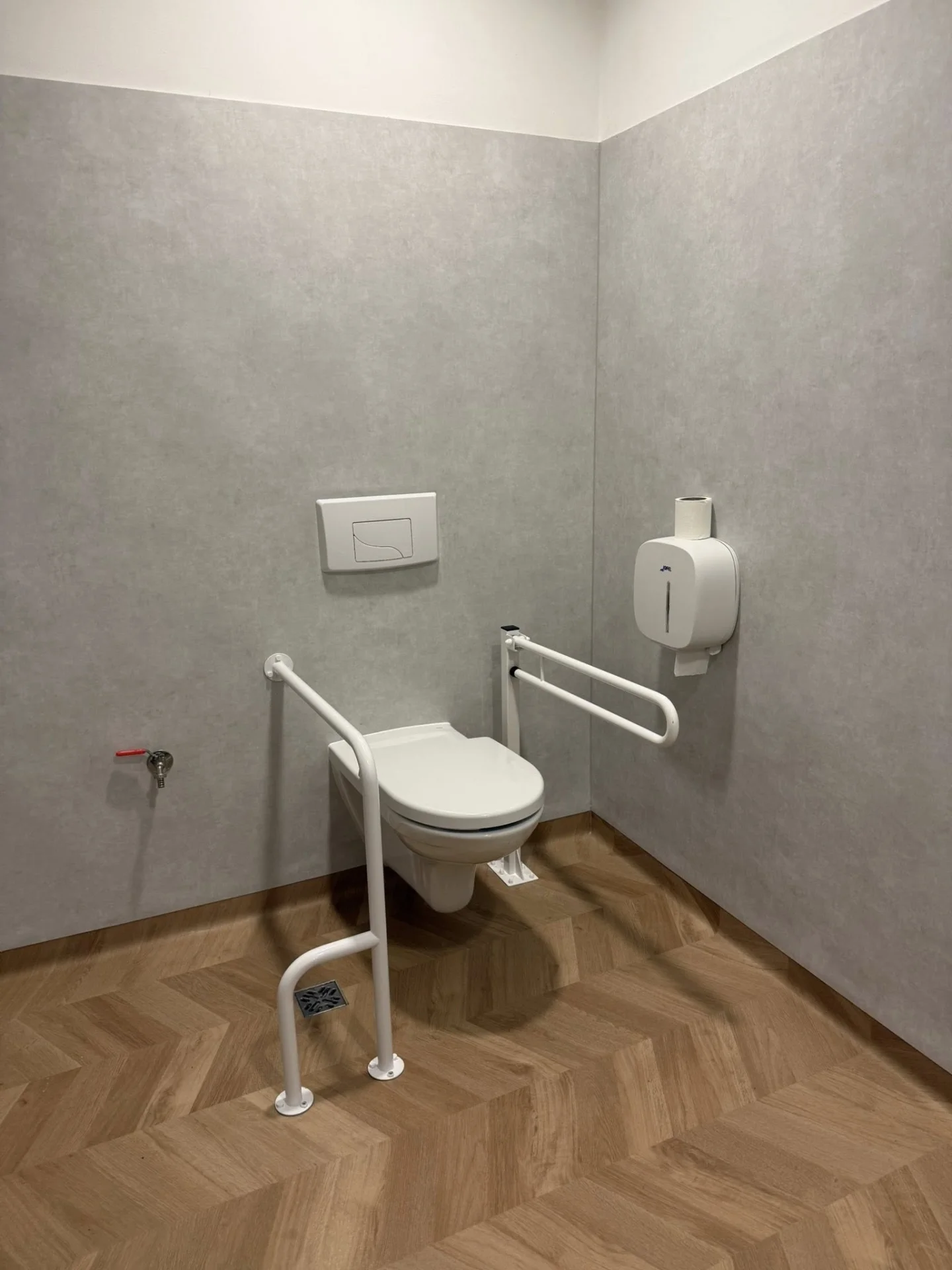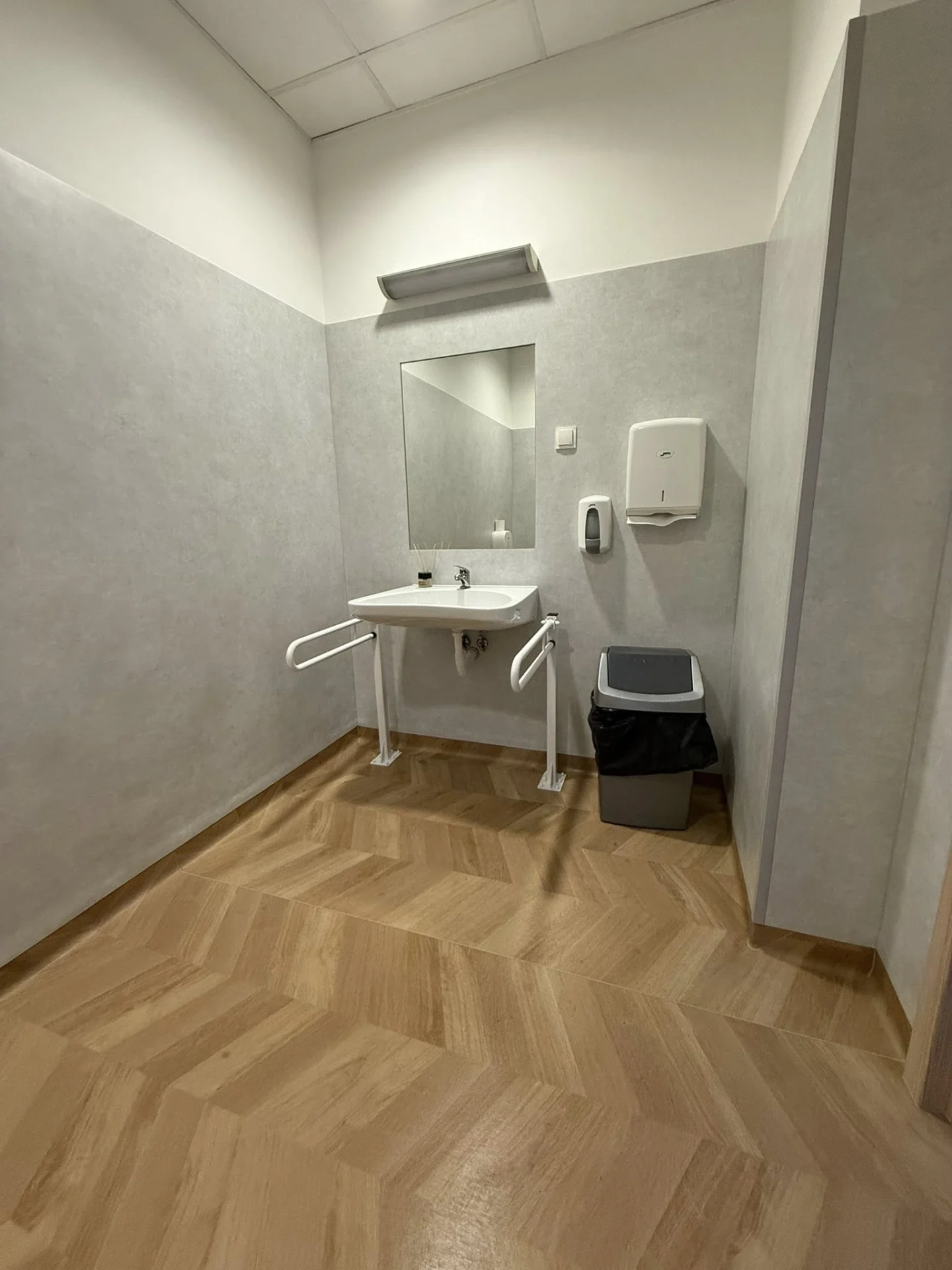 - Ściany – zastosowaliśmy wykładzinę ścienną marki Gerflor, która wyróżnia się odpornością na wilgoć i łatwością w utrzymaniu czystości. To idealne rozwiązanie do pomieszczeń sanitarnych, gdzie wymagana jest najwyższa higiena.