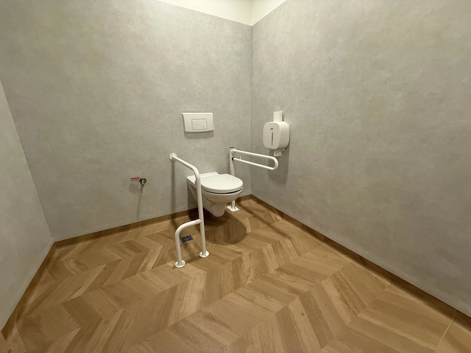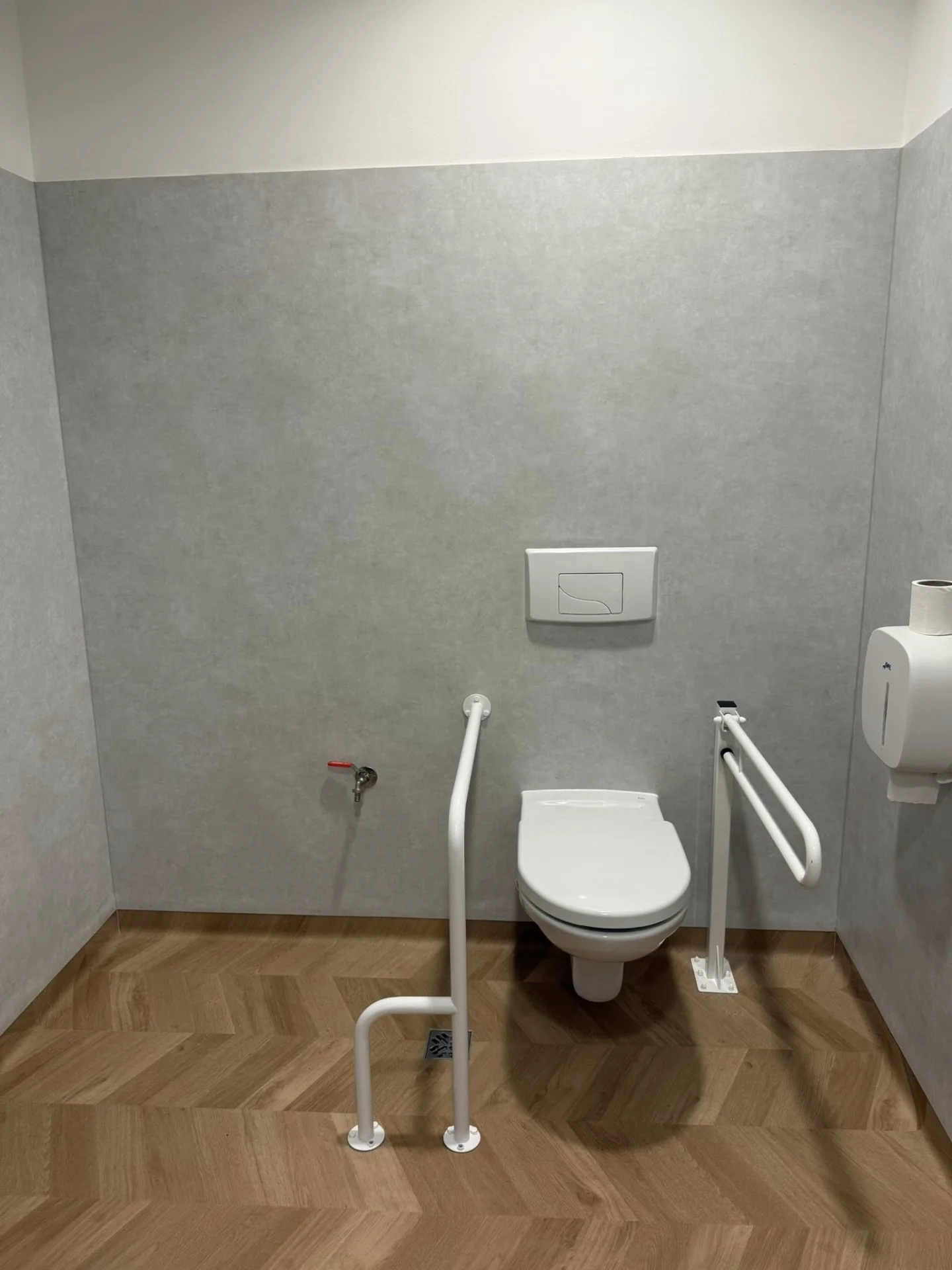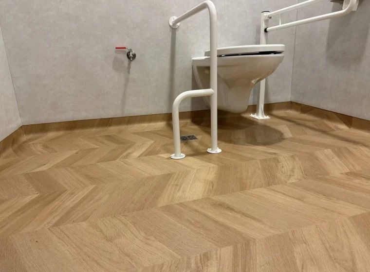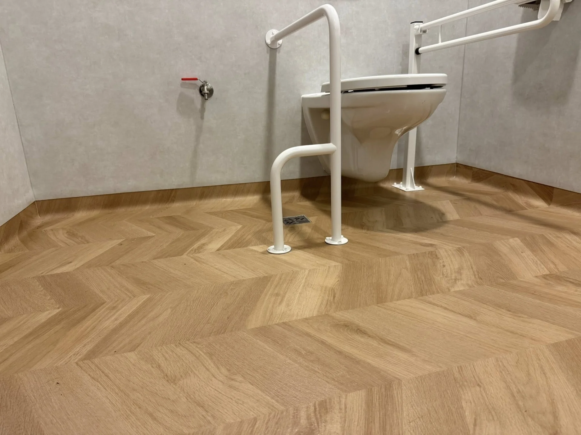 - Ściany – zastosowaliśmy wykładzinę ścienną marki Gerflor, która wyróżnia się odpornością na wilgoć i łatwością w utrzymaniu czystości. To idealne rozwiązanie do pomieszczeń sanitarnych, gdzie wymagana jest najwyższa higiena.