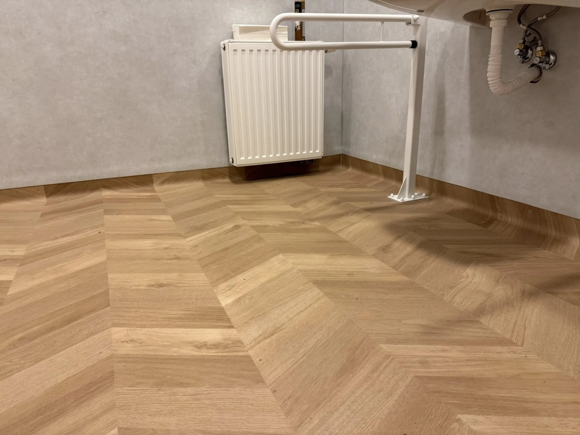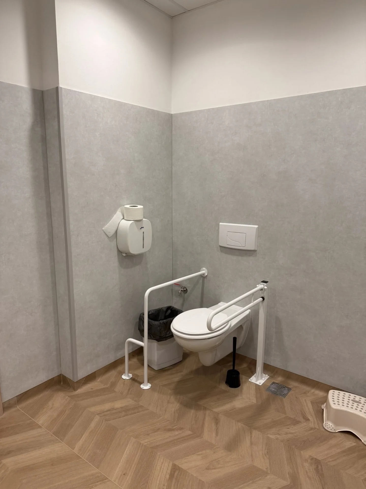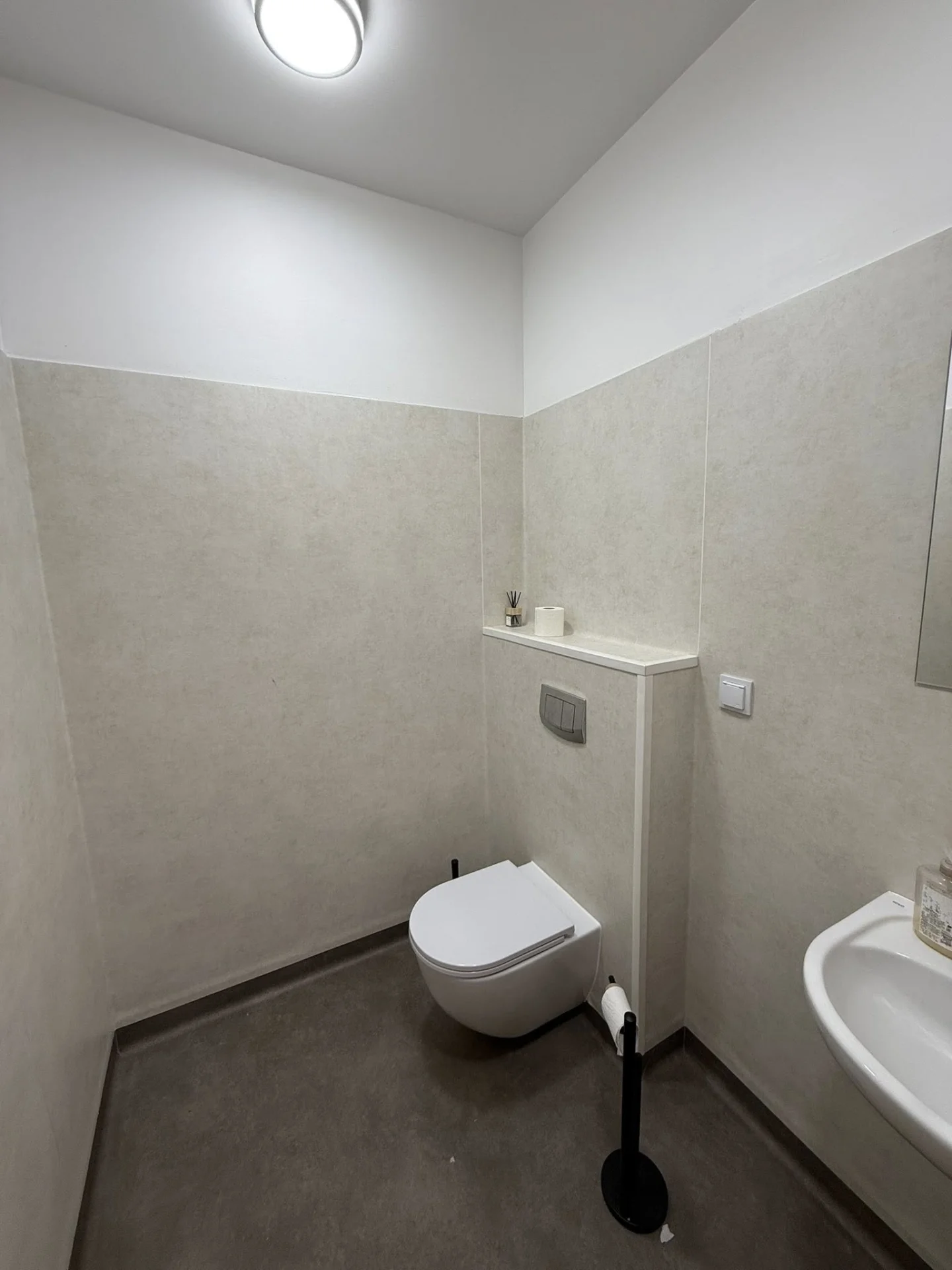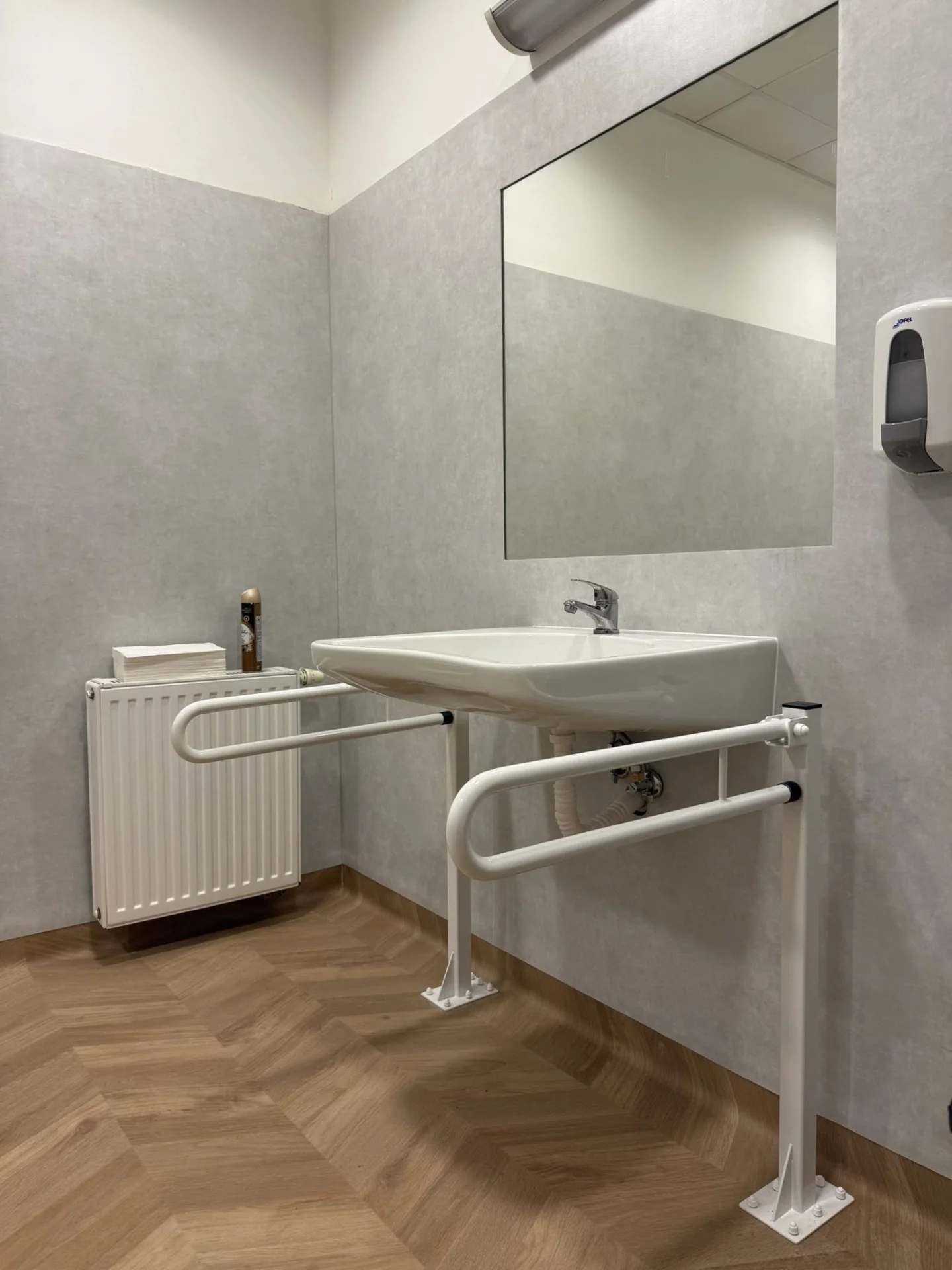 - Ściany – zastosowaliśmy wykładzinę ścienną marki Gerflor, która wyróżnia się odpornością na wilgoć i łatwością w utrzymaniu czystości. To idealne rozwiązanie do pomieszczeń sanitarnych, gdzie wymagana jest najwyższa higiena.