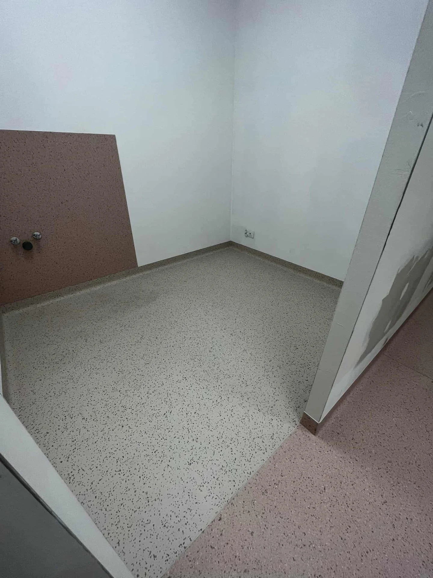 Szczególną uwagę poświęciliśmy obszarom przy przyszłych umywalkach, gdzie wykładzina została precyzyjnie wywinięta i zamontowana na ścianach. To rozwiązanie zapewnia: