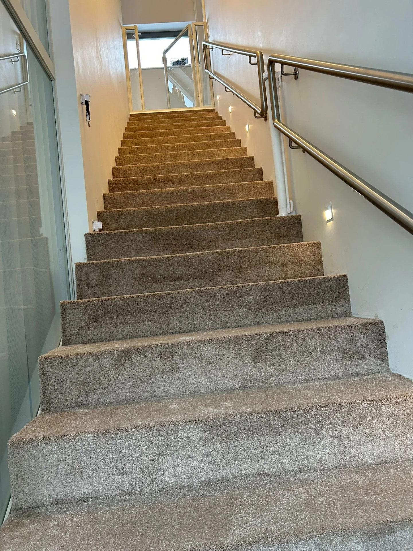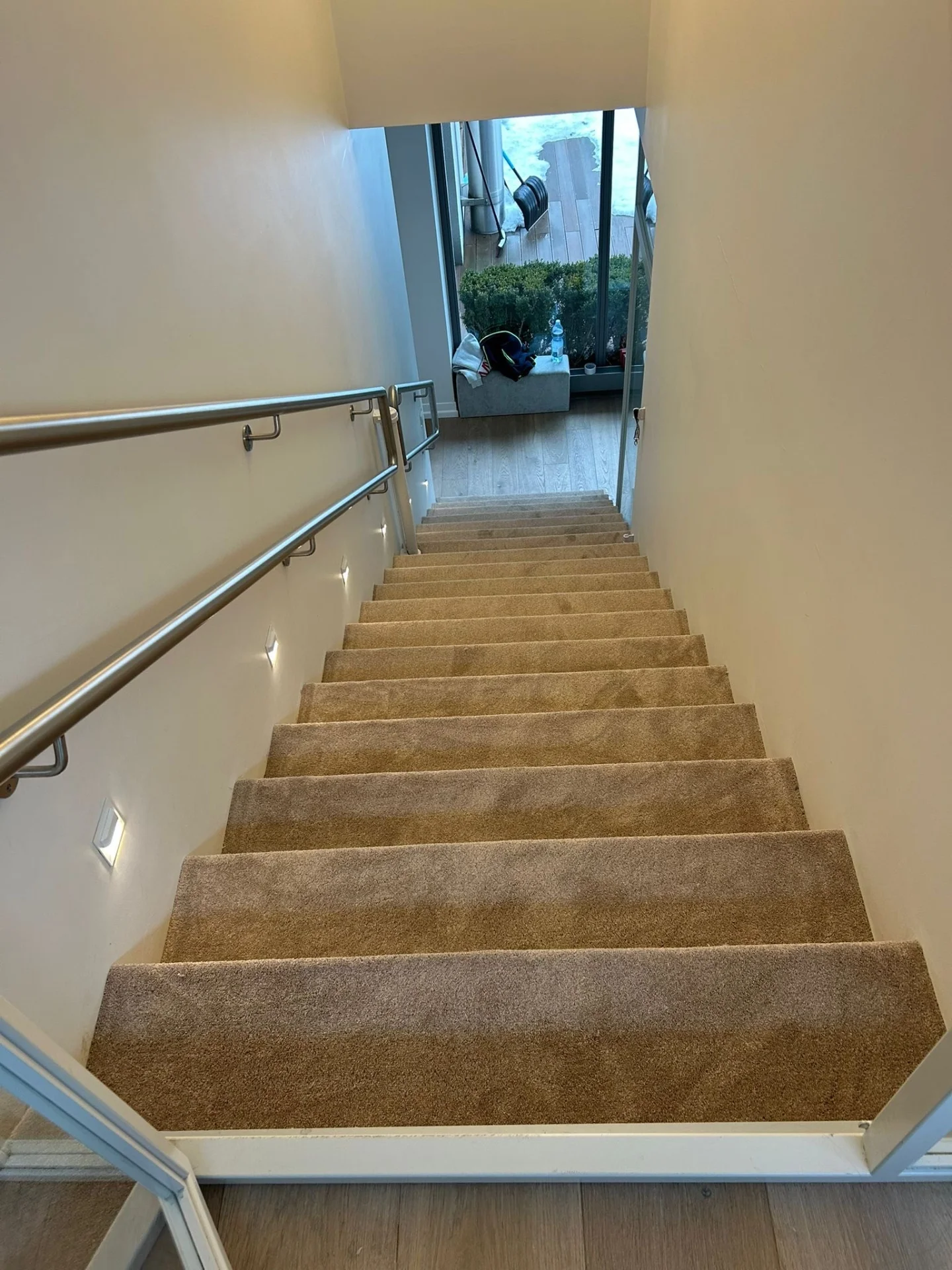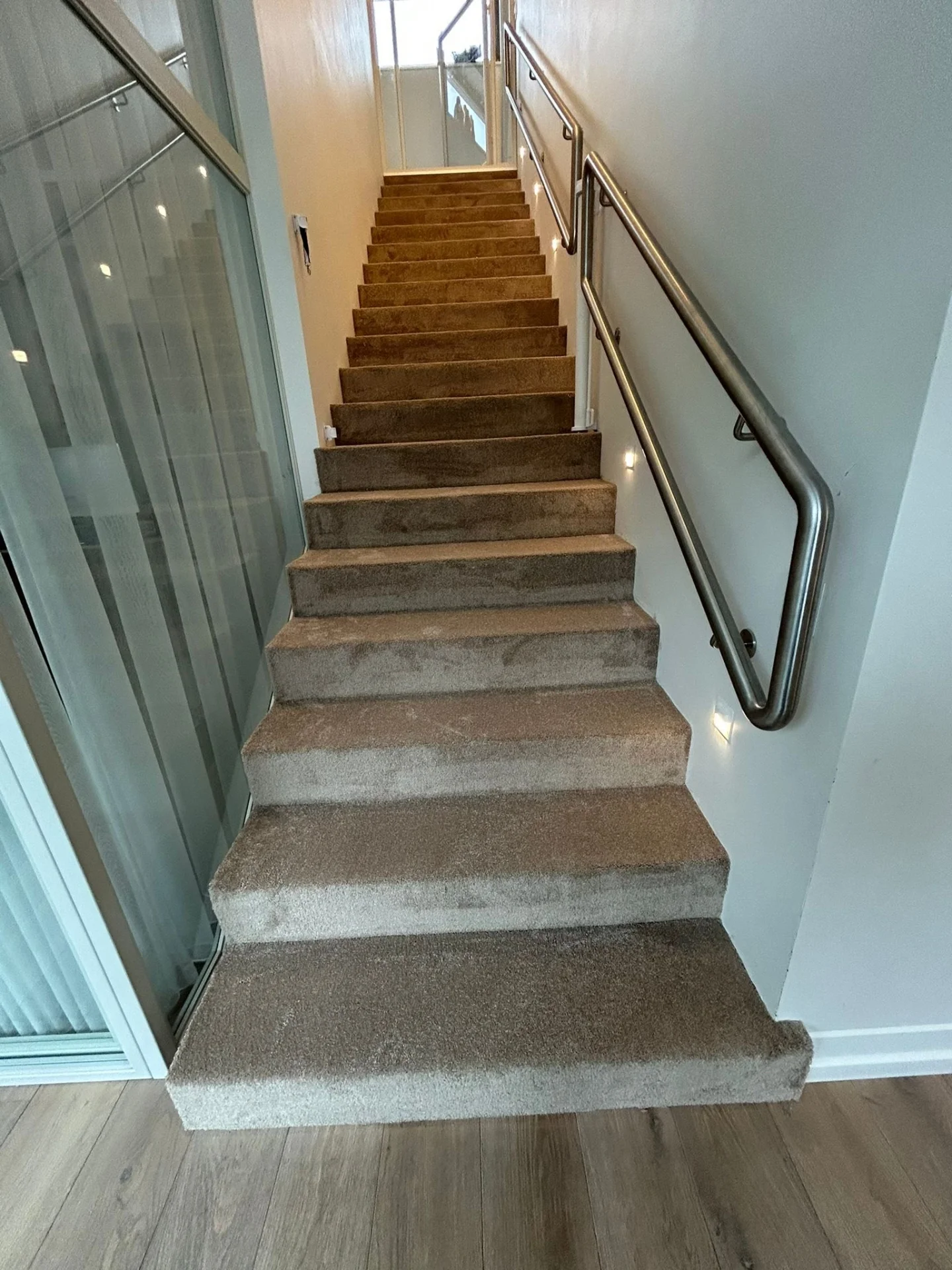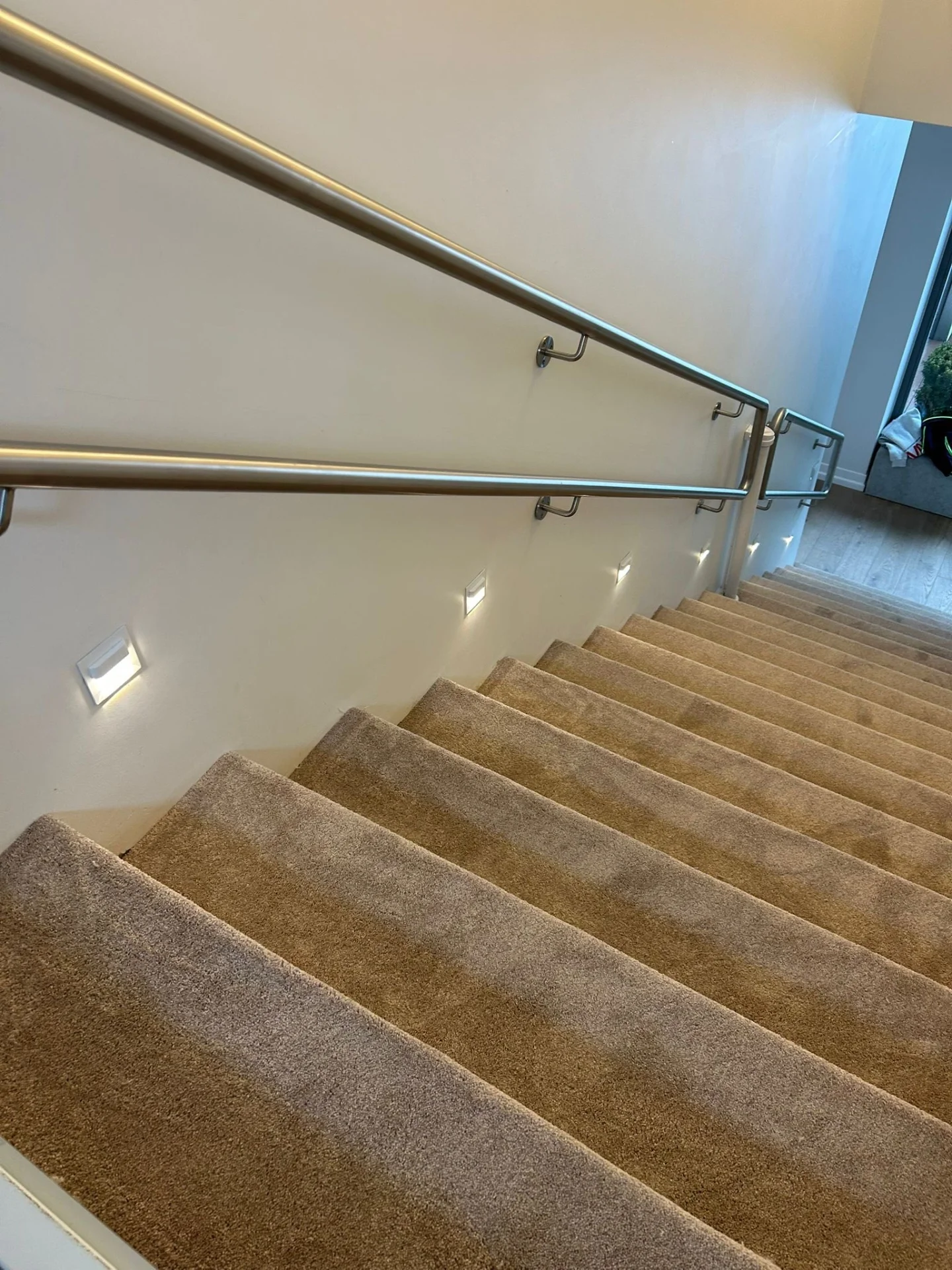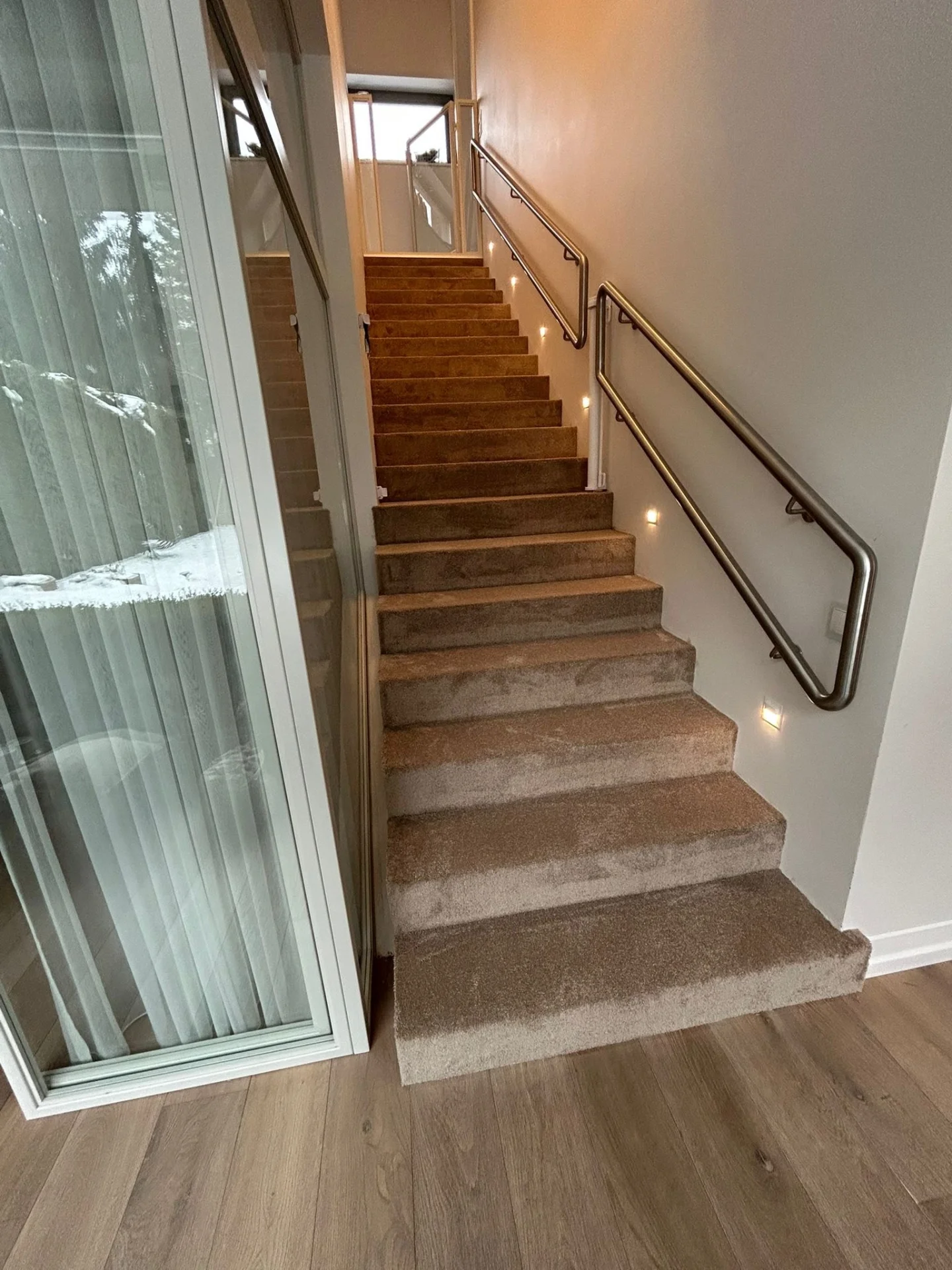Gotowe schody prezentują się elegancko i nowocześnie – ciepła, beżowo-karmelowa kolorystyka wykładziny doskonale harmonizuje z białymi ścianami, srebrną stalową balustradą oraz podświetleniem LED wmontowanym w ścianę. Miękkie wykończenie każdego stopnia i podstopnicy nadaje wnętrzu przytulny charakter przy zachowaniu wysokiego standardu wykonania.