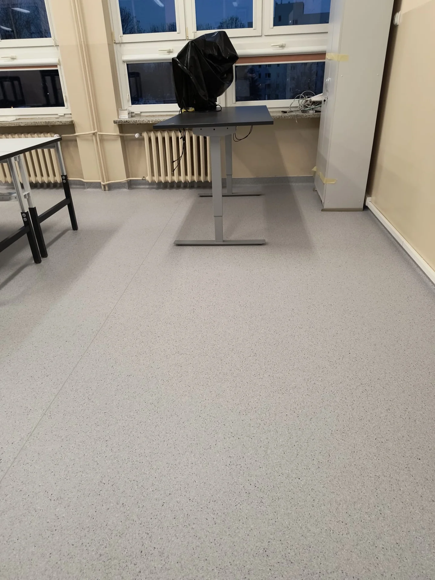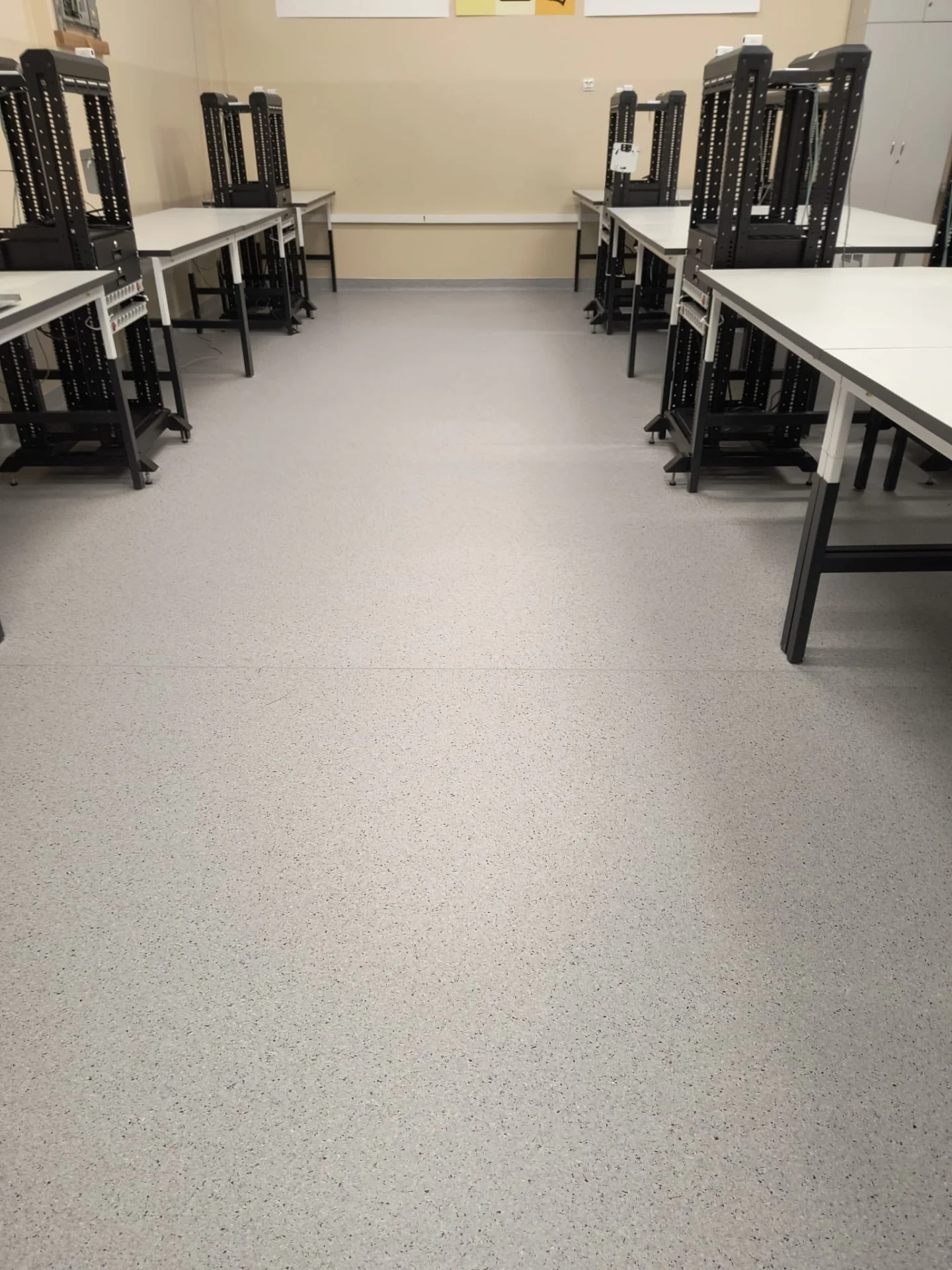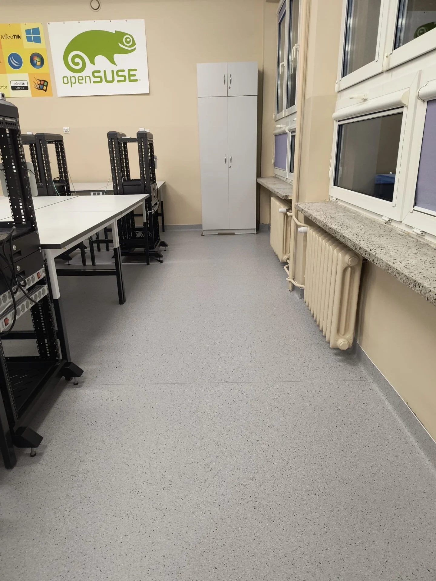 Zakres prac obejmował salę komputerową oraz trzy gabinety. W sali komputerowej, gdzie wymagane są szczególne właściwości antyelektrostatyczne, zainstalowaliśmy wykładzinę prądoprzewodzącą. To rozwiązanie chroni wrażliwy sprzęt komputerowy przed wyładowaniami elektrostatycznymi, zapewniając bezpieczeństwo infrastruktury IT oraz komfort pracy użytkowników.